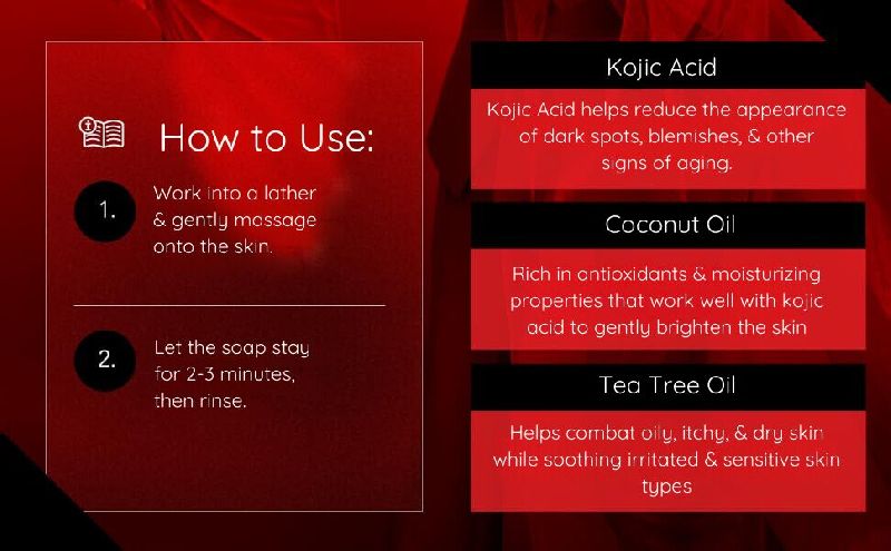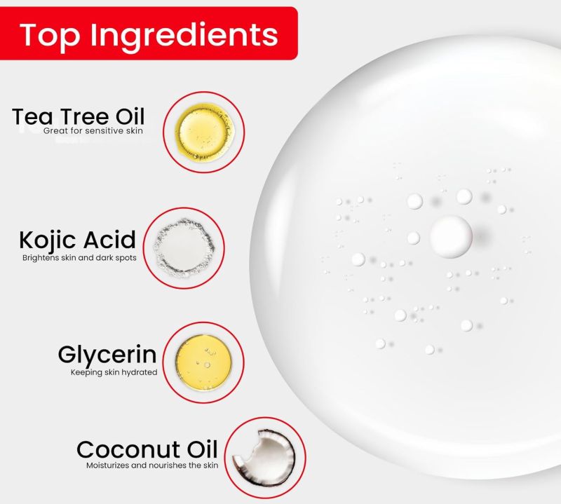 Cocos nucifera (Coconut) Oil, Water, Sodium Hydroxide, Fragrance, Kojic Acid, Glycerin, Xanthan Gum, Caprylyl Glycol, Phenoxyethanol, Glucose, Chondrus crispus (Carrageenan) Extract, Ethylhexylglycerin, Cocamide DEA, Paraffinum Liquidum, Melaleuca alternifolia (Tea Tree) Oil, CI 15985, CI 19140, BHT